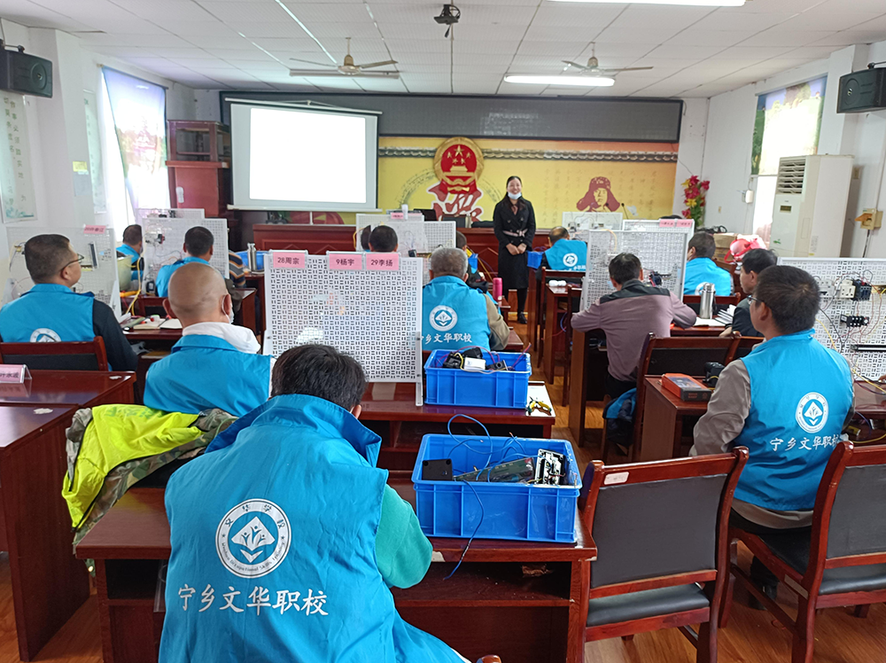 此次电工技能训采用理论与实践相结合的方式,主要对村民们进行变压器的使用与维护、直流交流电路、电动机控制线路、电动机的使用与维护、常见的室内配线、照明线路的安装与检修、电动工具、工厂供电、工厂变电所的主要电气设备等方面的专业培训。培训课上,授课教师耐心地为村民们讲解了电工安全生产以及基础常用知识,并将村民分组实操学习,手把手的教导学员们如何安装与调试线路,努力让每一个学员都能快速的掌握电工技能。课堂上,村民们专心听讲、积极互动,认真参与电路安装与调试,学习氛围活跃浓厚。