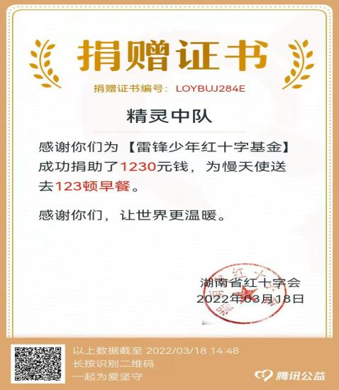 在公益方面也非常突出,鑫宇学会了尝试去做一个优秀的组织者和领航人,创立了“精灵中队”,经常组织小伙伴奉献爱心活动。