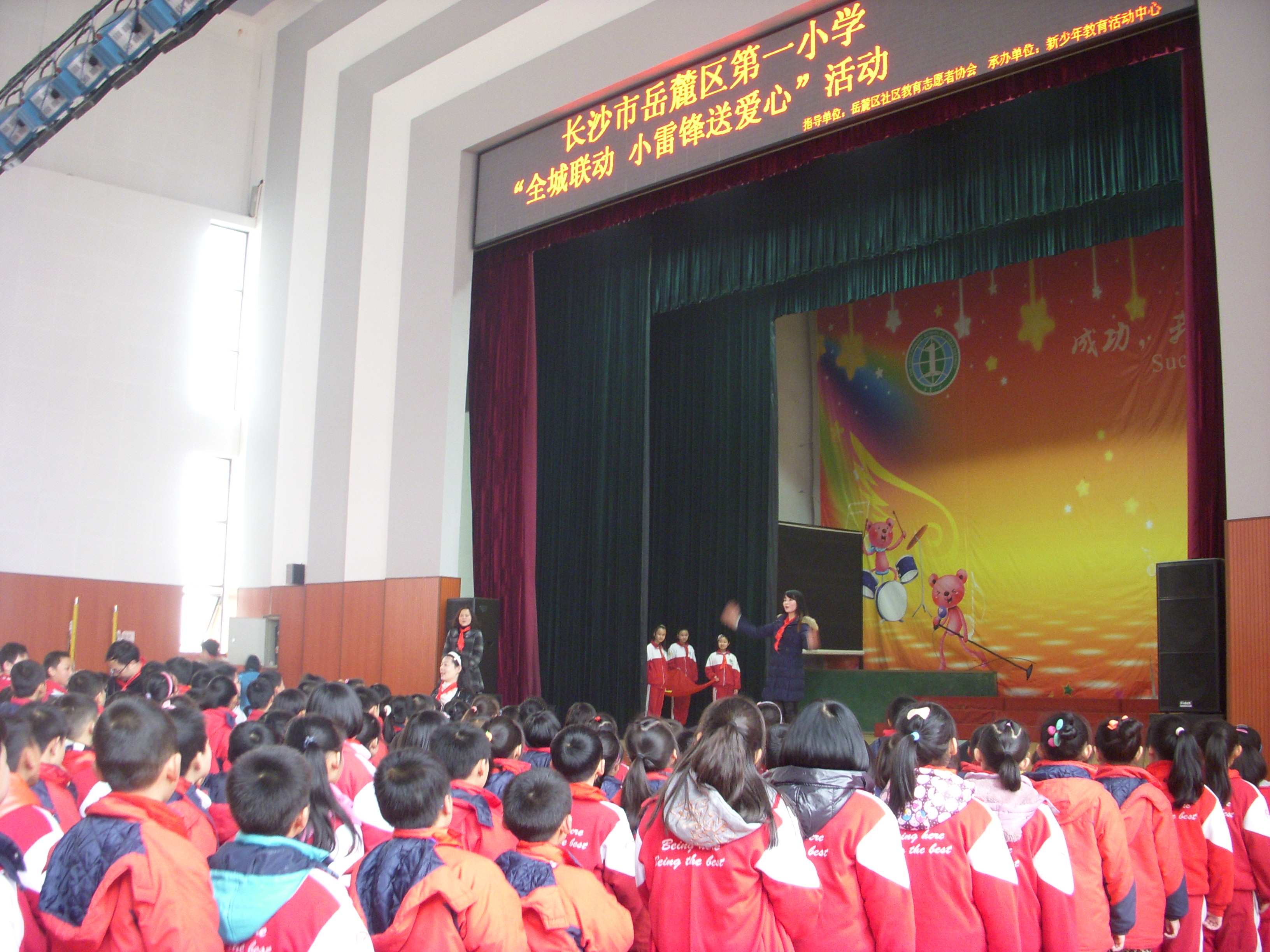 “学习雷锋好榜样,忠于革命忠于党……”,歌声嘹亮,红领巾飘扬。岳麓一小礼堂里传出250多名同学嘹亮的歌声。这次活动由长沙市岳麓区志愿者协会主办、新少年教育活动中心承办,在长沙政法频道、长沙新闻频道和湖南教育频道等多家媒体大力支持下共同开展“全城联动,小雷锋送爱心 ”关爱慰问弱势群体爱心体验活动。整个活动分为六个小组,分别前往雨敞坪、第二福利院、岳麓区敬老院、芙蓉居家养老服务机构、大托铺敬老院、开福区环卫工人。