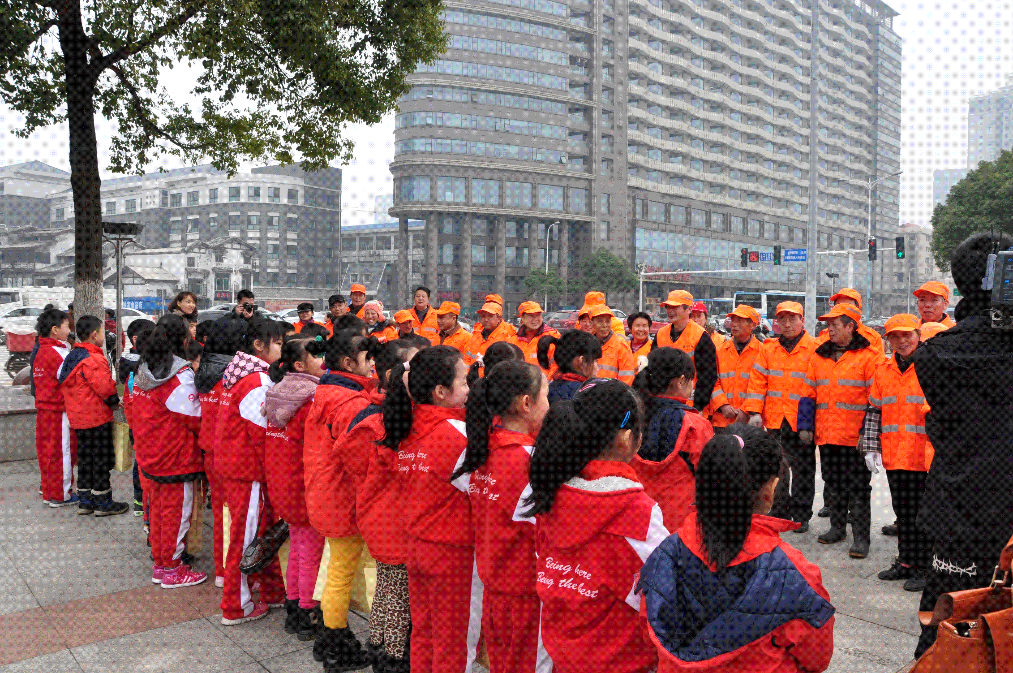 第五只小队的同学们来到开福区沿江风光带风帆广场慰问环卫工人。一下车就受到一群“靓丽的橙色”的热烈欢迎,孩子们一对一的牵着环卫叔叔、阿姨向他们问好并赠送礼物。