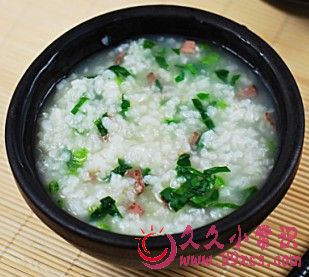 做法:将菠菜洗净,在沸水中烫一下,切段;粳米放锅内,加水适量,煎熬至粳米熟时,将菠菜放入粥中,继续煎熬直至成粥时停火;再放入食盐、味精即成。