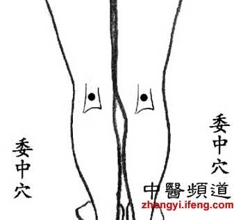 屈腿时,膝关节后侧也就是窝的位置出现横纹,而横纹的中点处即是委中穴。在针灸的“四总穴歌”里提到“腰背委中求”,可见,委中是治疗腰背病症的要穴。