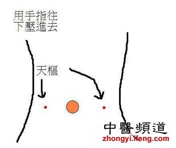 天枢是胃经上的一大要穴。位于肚脐旁2寸处,与肚脐同处于一条水平直线上,左右各有一穴。