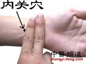 伸开手臂,掌心向上。然后握拳并抬起手腕,可以看到手臂中间有两条筋,心包经上的内关穴就在离手腕第一横纹上两寸的两条筋之间。内关穴有宁心安神、理气止痛等作用,因此经常成为中医医治心脏系统疾病以及胃肠不适等病症的首选大穴。