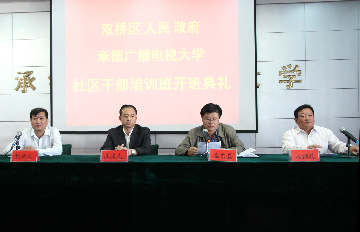 收藏为提升社区干部的整体素质,提高我市和谐社区建设水平,加快学习型城市的构建脚步,我校社区教育学院与双桥区委、区政府联合举办为期9天的社区干部培训班。9月18日举行了开班典礼。承德市政协副主席、承德广播电视大学校长孔庆龙、承德广播电视大学党委书记姚钢乾、双桥区政府常务副区长崔东鑫、双桥区组织部长刘延民出席了开班典礼。