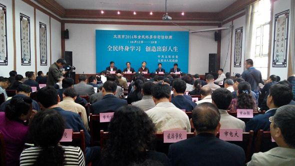 收藏2014年10月10日上午,市委、市政府在山西省民俗博物馆召开太原市2014年全民终身学习活动周启动仪式。市全民终身学习活动周领导组组长、中共太原市委副书记荣彤,市全民终身学习活动周领导组常务副组长、太原市政府副市长薛忠晋,出席会议。中国成人教育协会常务副会长张昭文、省成人教育协会会长张秉让等专家受邀出席会议。市委各部委(工委)、市政府各委、局、办负责人,各县(市、区)政府负责人,各人民团体负责人,新闻记者约110人参加了会议。会议由市全民终身学习活动周领导组常务副组长、太原市政府副市长薛忠晋同志主持。