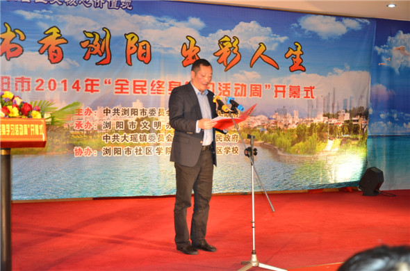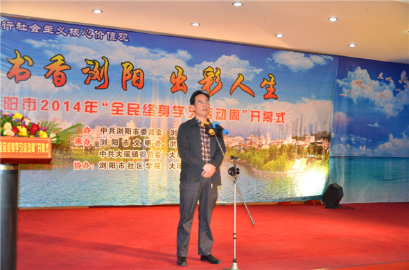 在启动仪式上,中共大瑶镇党委书记李爱民首先致欢迎词,接着是市社区教育领导小组办公室主任、市社区学院院长、市教育局局长陈耀文作社区教育工作报告,报告全面总结了浏阳市上年度社区教育工作成绩,提出了近期工作设想。浏阳市委常委、市委宣传部部长刘旭宣读了有关表彰决定和成立七所社区学校的批复,长沙市教育局副局长李平作了重要讲话。最后,浏阳市委副书记吴震讲话并宣布“浏阳市全民学习活动周”开幕,他希望大家围绕学习型城市建设,大力普及开展全民终身学习活动,宣传终身教育思想,强化全民学习意识,激发全民读书热情,积极打造翰墨飘香、格调高雅、文明健康的生活方式,营造稳定、和谐、文明健康的社会环境。