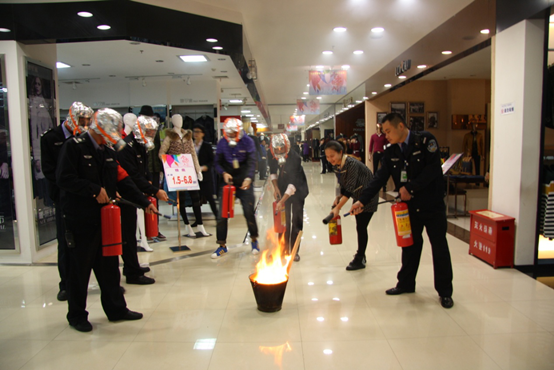 演练现场,商场某部位出现明火,现场人员立即报告商场商场主要负责人和消防控制室,现场指挥组、灭火组、抢救组、疏散保卫组人员各司其职,广播迅速传来应急疏散通知,疏散保卫组人员立即奔赴各通道口,组织顾客和员工有序疏散撤离,灭火组人员赶到火源处手持消防灭火器对准火源根部进行扑灭。随后,抢救组人员对受伤者进行抢救,对重要物资进行抢运。在指挥组有条不紊的指挥下,整个演练活动井然有序,快速高效。