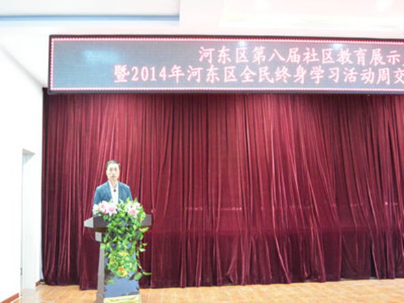 首先河东区教育局局长、区社区教育办公室主任郑庆东为本次活动致辞。指出:社区教育在落实全民终身学习的学习型社会中,发挥着重要作用,主题鲜明的活动,丰富的教育内涵,为终身学习活动成为展示社区教育成果,交流社区教育思想搭建了空间。将学习融入生活,养成终身学习习惯,提升居民幸福生活指数,使终身学习的理念深入人心,进一步提升了社区教育的知晓度和满意度。今年活动周主题是“全民终身学习,创造出彩人生”,也以此拉开了我区全民学习活动周的序幕。我区的全民学习活动周正以一种常态化的工作成为社区教育品牌,社区教育也将在河东区创建学习型城区中发挥积极作用。