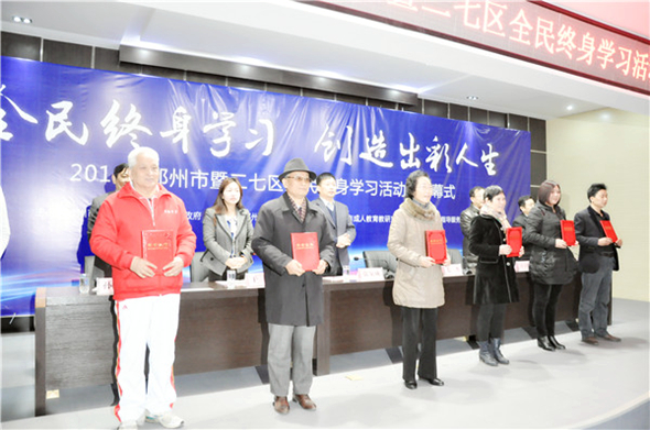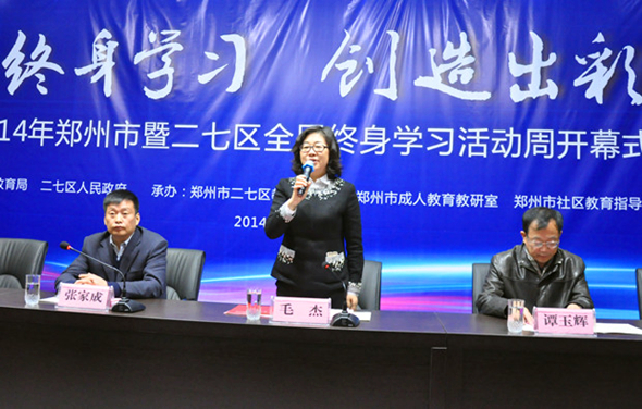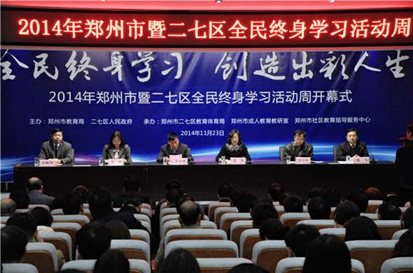 “2014年郑州市暨二七区全民终身学习活动周”开幕式由郑州市教育局和二七区人民政府主办,郑州市成人教育教研究室、郑州市社区教育指导服务中心和二七区教体局承办。