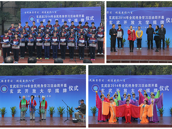 仪式中,获得市级学习之星、优秀志愿者代表、获得“走进博学玄武学习超市、寻觅玄武历史文化印记”博学玄武学习在线网上阅读活动的先进集体和个人代表与大家分享了学习体会,来自玄武开放大学学生及锁金村街道锁二社区居民学校、梅园新村街道社区教育中心的居民们以说唱、舞蹈等形式汇报、展示了社区教育学习成果,受到大家欢迎。玄武区为全民终身学习提供优质服务、成为玄武区社区教育机构的补充平台的玄武社区学堂,作为江苏省唯一入选了2014年全国十佳“特别受百姓喜爱的终身学习活动品牌”。在仪式中,向大家展示了获得的奖杯和证书。