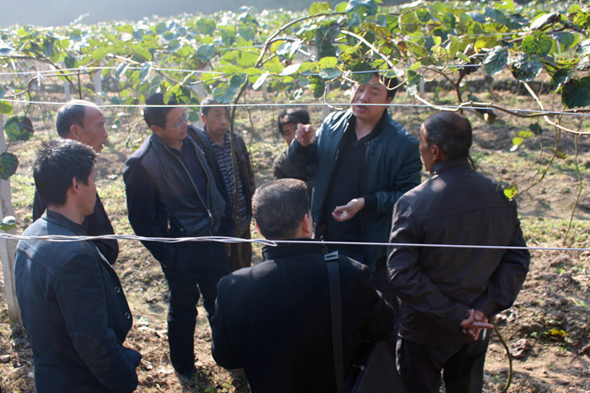 “这些细弱枝、枯枝、病虫枝、交叉枝、螺旋枝和重叠枝都要在冬季修剪时剪掉。”鲍金平一手指着二年生猕猴桃枝蔓一手拿着修剪刀比划着说。来自景宁县的学员潘岩根也不时插话提问:“结果母枝怎样留取?溃疡病怎样防治?”在基地里,鲍金平就红心弥猴桃等品种特性、整形修剪技术、病虫害防治等关键技术进行了讲授和现场指导。大户们问得仔细,鲍金平回答的认真。这些技术贴合丽水市种植户的实际,为猕猴桃冬季修剪整理、病虫害预防送来了宝贵的技术和技能。