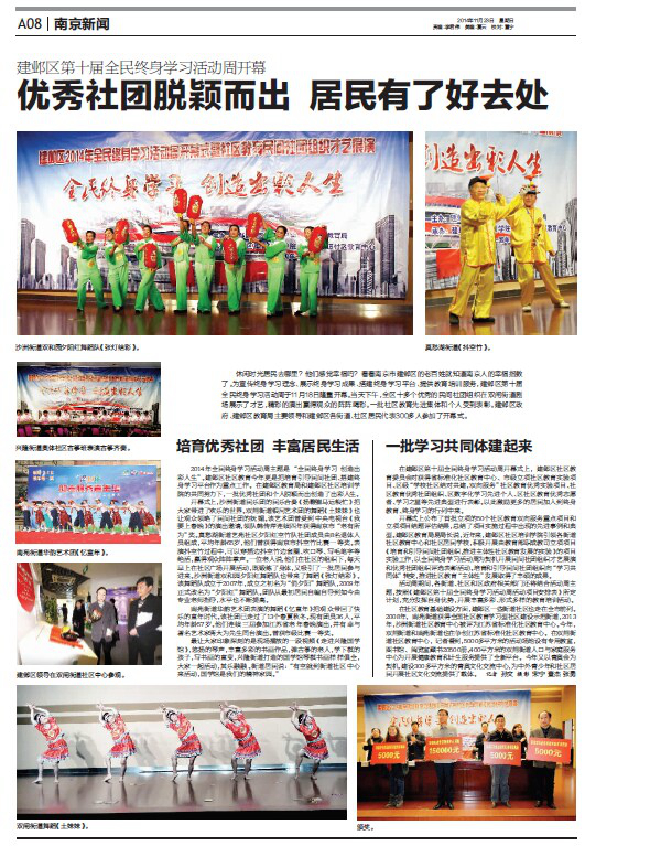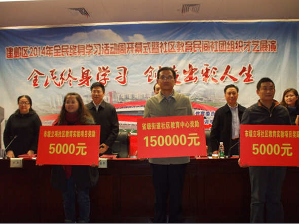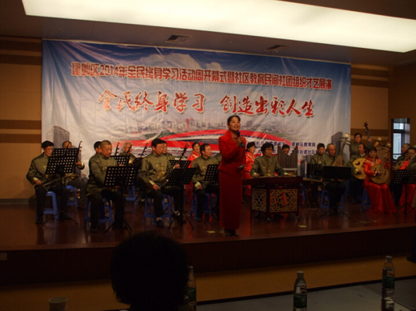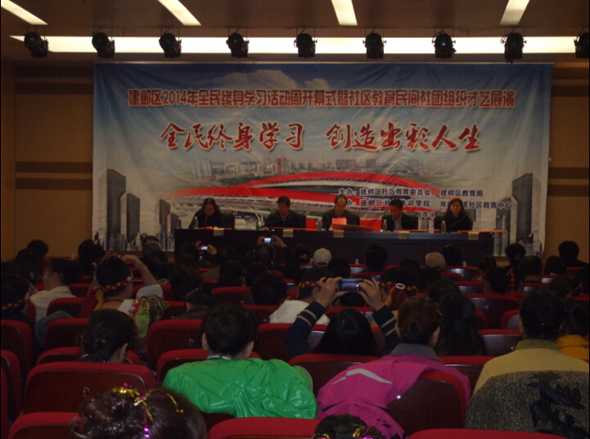 收藏 为宣传终身学习理念、展示终身学习成果,推进学习型社会建设进程,建邺区2014年全民终身学习活动周开幕式暨社区教育民间社团组织才艺展演于11月18日在双闸街道社区教育中心小剧场隆重举行。区政府、市教育局主管部门、区教育局领导,各街道、社区和区社区教育委员会成员单位分管领导,中小学分管校长以及社区居民代表约300人参会。