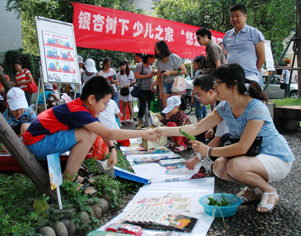 2014年8月清水河社区组织举办的暑期跳蚤市场也开市了,孩子们在这里进行书籍、文具和玩具等的买卖和交换,有的同学还拿出了自己的手工制品现场售卖,孩子们从自己的劳动中得到了收获,从卖力推销自己的物品中体会到了赚钱的不易,认识到勤俭节约的重要性,也让他们对怎样打理自己的财物有了初步的思考。
