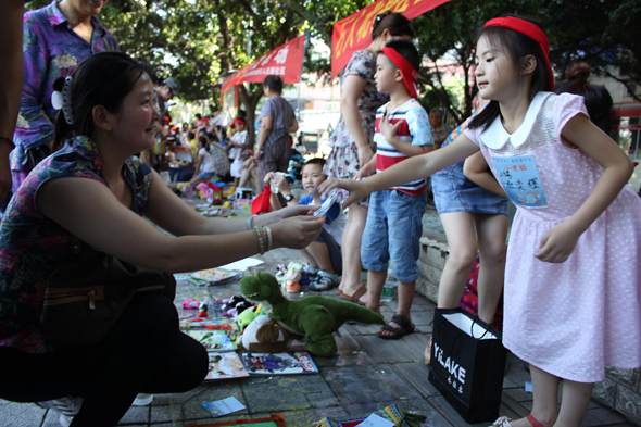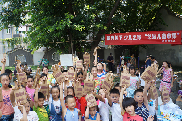 在石人北路精品社区教育工作站的引领下,商业街精品社区教育工作站于2014年7月26日上午组织了“悠游儿童市集”暑期青教活动,活动一开场,仁厚街花园里即是人声鼎沸。孩子们的玩具、图书、文具、小工艺品、食品等各种宝贝摆满了“市集”。每一位“淘家”快乐地穿梭在人群中,寻找自己心仪的商品,孩子们的脸上都挂满了兴奋的微笑,那是因为孩子们都知道,自己参与的不仅是一次特别的生活体验,更是以实际行动践行低碳、环保、节约型社会的生活理念。