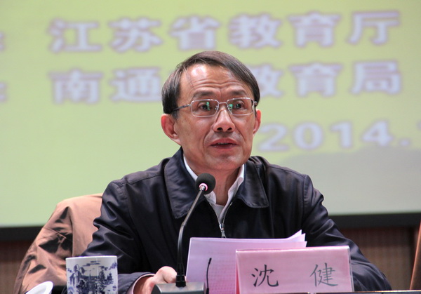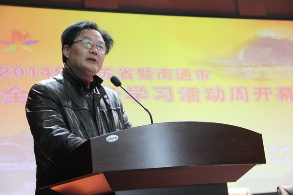 江苏省教育厅厅长沈健讲话。他指出,全民终身学习活动周在我省已经走过了五个年头,已经成为我省及各地建设终身教育体系、构建学习型社会的重要载体和特色品牌。全民终身学习活动周的举办,广泛传播了终身学习理念,把中央关于“建设学习型社会”的部署落到了实处,群众参与度与社会影响力不断提升,有力地推进了学习型社会建设,形成了一大批终身学习成果与品牌,在推动社会经济发展、服务新型城镇化建设、促进社会建设管理创新中发挥了重要作用。沈厅长指出,前不久教育部、中央文明办、国家发展改革委等七部门下发了《教育部等七部门关于推进学习型城市建设的意见》,就推进学习型城市建设做出了总体规划,希望南通积极构建终身学习服务平台;广泛开展城乡社区教育;着力打造终身教育特色品牌,全面落实党的十八大、十八届三中、四中全会和习近平总书记系列重要讲话精神,贯彻省委省政府的部署要求,坚持制度化、规范化、常态化方向,加快推进社区教育示范区和社区教育机构建设,不断提升终身教育水平,为构建学习型社会,服务“两个率先”作出新的更大贡献。