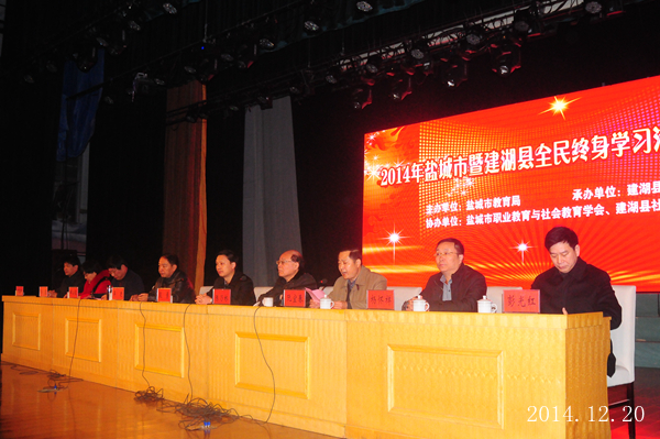 12月20日,盐城市暨建湖县全民终身学习活动周开幕式在建湖社区学院隆重举行。今年我市学习活动周的主题是:“全民终身学习,创造出彩人生”。来自全市各县(市)区的180多名代表聚集一堂,共同探讨如何推进全民终身学习,加快发展社区教育。当天,有300多名社区市民参加了活动。开幕式由盐城市委教育工委副书记邹必俊主持,省市县相关领导出席了开幕式并讲话。