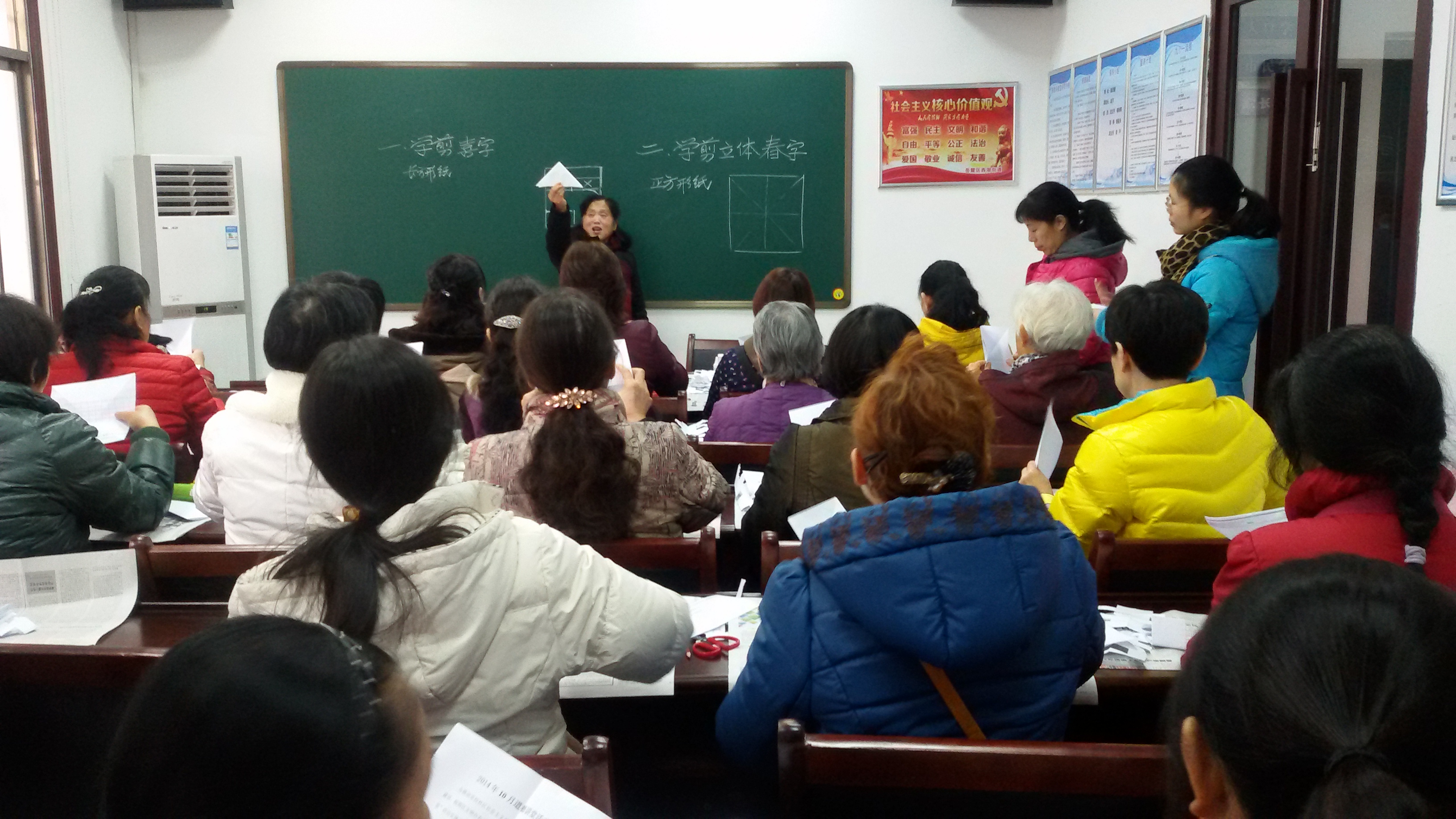 马老师第一堂课主要教“喜”、“春”等对称剪纸,边讲解边给大家做示范,大家都全神贯注地一边听着一边动手剪着。短短的一个半小时,一个个剪纸作品就出现在我们学员的手中。