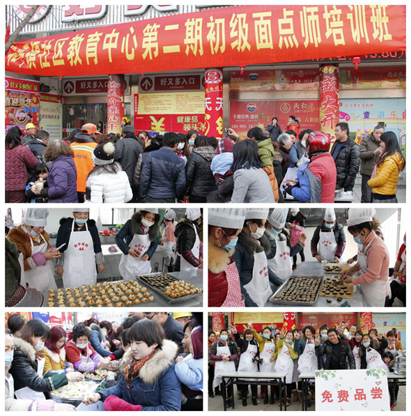 大家把冒着香气的面点抬到了和平街“好又多”超市前的场地上,开始了免费派送活动。当人们得知和平社区教育中心面点班在搞免费品尝面点的消息后,从四面八方涌来。大家领到食品后乐滋滋地品尝着,有的还不忘拿出手机当起了拍客。有位头发斑白的老大妈领了点心好奇地看着,嘴里还不住地嘀咕着:“这叫什么东西?怎么做的呀?活了七十多年还头次见呢”。旁边的人叫她快尝尝什么味道。谁知老大妈赶紧把面点葳到塑料袋里,一本正经地说要赶紧拿去给孙子吃。老大妈的这份舔犊之情引来了大家善意的笑声。