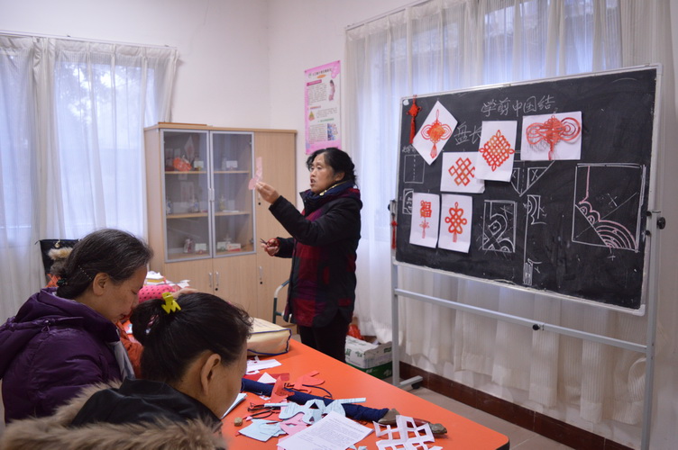 马老师表示,这次重新开学,将主要教授大家学习剪人物头像和十二生肖。由于还在正月里,本学期第一次课马老师教大家剪了几种简单的中国结。对于本学期新报名的学员,马老师也细心地照顾到了他们的零基础情况,教授了他们一些基础的纹样、剪纸的绘画和剪纸的表现形式等知识。她把自己剪的几个栩栩如生、寓意吉祥的中国结贴在了黑板上,再将剪纸步骤一一用粉笔写下,并且现场示范教学,短短两个小时,大家就学会了好几样中国结的不同剪纸样式。交出了令人满意的作品。