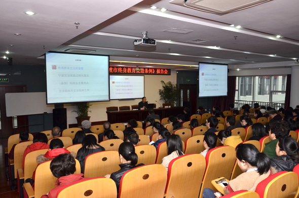 学习宣讲会上,陈曙校长从《宁波市终身教育促进条例》的出台背景、实践过程与意义、架构及主要亮点、立法趋向与立法后的工作这四个方面作了详细解读。