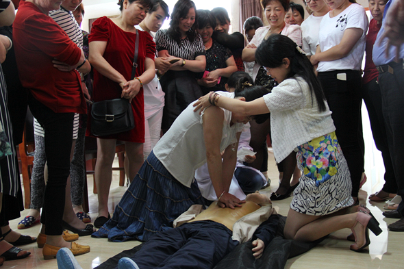 本次培训邀请了红十字会救护培训老师丁学文,徐芬,高斌进行现场指导。第一天上课的丁学文老师为学员们生动、幽默地介绍了心肺复苏、创伤救护、排除气道异物等基本技能。在培训现场,学员们学习积极性很高,边听边记,表现出了极大的兴趣。丁老师还采用亲身示范、手把手传授、实践现场点评等方式,耐心细致地指点每一位参训学员。