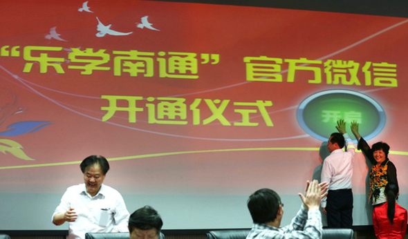 随后,领导们共同为获得“2014年度百姓学习之星”、“全市社区教育先进工作者”、“2014年度社区教育宣传先进集体、先进个人”颁奖;市委常委、宣传部部长章树山和市人大副主任程静为南通市社区教育服务指导中心揭牌;南通开放大学党委书记刘启东与市文广新局局长陈亮签署了《政校协作共建“书香南通”合作协议》;市文广新局局长陈亮代表组委会发布了2015年南通市首届社区教育艺术节项目;最后,市委常委、市委宣传部部长章树山和市人大副主任程静共同开通了“乐学南通”官方微信公众号。