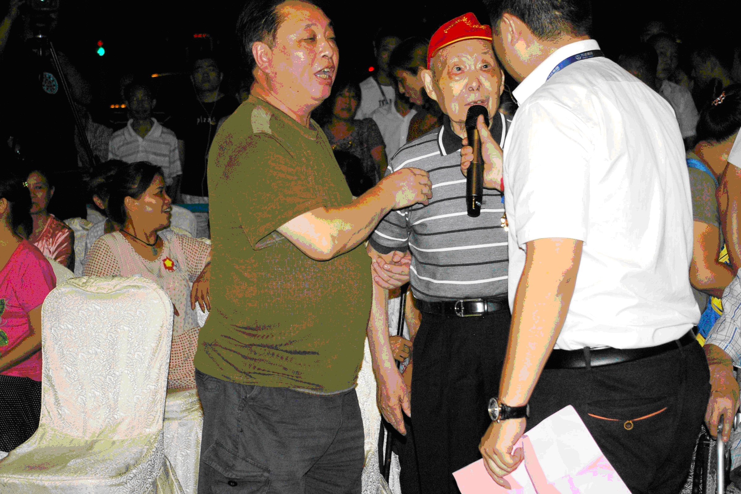 默哀仪式后,主持人对两位被邀请到活动现场的抗战老兵进行了简单采访,让他们为观众讲述当年发生在他们身上的抗战故事。接着,街道领导给两位抗战老兵送上了慰问金,小朋友为老兵敬献了鲜花。