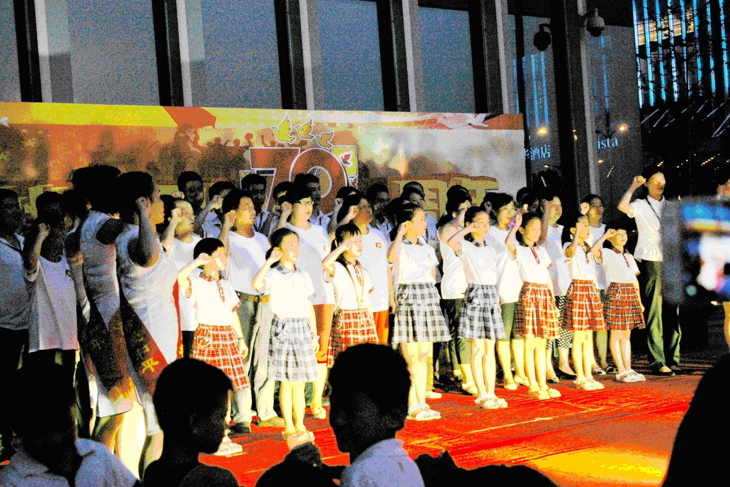 随着铿锵有力的军鼓表演结束,主持人宣布庆祝活动正式开始。首先,主持人建议全体人员起立,为在抗战中英勇献身的烈士和被日军凶残杀害的无辜人民以及在今年4月12日天津危爆事故中牺牲的消防官兵、遇难的普通民众默哀一分钟。