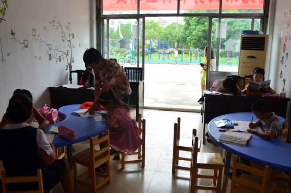一大早,金谷社区“少儿驿站”就变成了一个热闹的校外课堂,近20名小学生聚集在一起,或静静地阅读,或认真地书画、或凝神思考,专心地做着功课。凤凰中心小学的两位志愿者老师则耐心地为孩子们进行现场学习辅导。