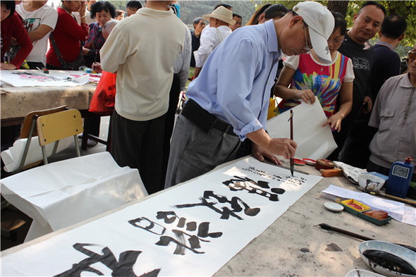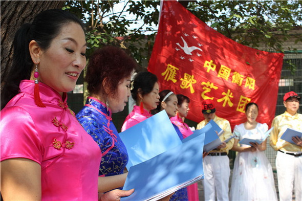 今年八十岁的向老正在挥笔书写,他说行草、隶书都是他的最爱,练习书法几十年了,心情愉悦的同时,还能延年益寿,所以他有空就练;旁边雁歌艺术团的周阿姨也准备一展歌喉,为大家献上合唱《雁归来》,她介绍,艺术团由珠晖区各个单位的老干组成,每个星期五上午都会排练,大家志同道合,趣味相投……