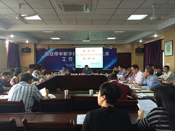 收藏为了确保瑞安市第三届“全民终身学习活动周”顺利开幕, 10月22日下午,瑞安市全民终身学习活动周工作协调会在职业中专教育集团学校召开。会议由市社区教育工作领导小组办公室副主任、瑞安城市学院副院长卢建平主持,市委宣传部(社科联)、市文明办、市教育局、瑞安城市学院、瑞安日报社、市广播电视台、塘下镇政府、陶山镇政府、锦湖街道办事处、市红十字会、市图书馆、市文物保护管理所、市社区教育协会、市职业中专教育集团学校等14家单位负责人和有关人员,城区部分社区学校和全市各等级社区学校负责人参加会议。