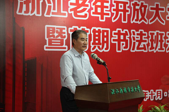 校党委书记、省社区教育指导中心主任方志刚致辞。他首先代表浙江广播电视大学党委、行政和全体师生员工向百忙之中莅临仪式的各级领导、各位来宾、各界朋友表示热烈的欢迎,向热情关心和倾力支持浙江老年开放大学成立的上级有关部门、社会各界和兄弟院校表示衷心的感谢。他指出,人口老龄化是当今社会不容忽视的问题,老年教育供需严重失衡,这正是电大服务社会、体现价值与担当的有利契机,我们应乘势而为。根据郑继伟副省长关于加强老年教育的指示精神,学校组织开展了全省老年教育的现状调研,制订了推进老年教育的行动计划,并提出了依托电大增挂浙江老年开放大学牌子的积极愿望,得到了省政府以及相关部门的重视。郑继伟副省长、教育厅刘希平厅长等领导专门批示支持,给予我们莫大的鼓舞和激励。他表示,浙江老年开放大学将在省政府及省教育厅等有关部门的领导和支持下,切实履行起组织开展全省老年教育以及对全省电大和社区教育系统老年教育的业务指导、教育示范、师资培训、资源开发、平台建设、理论研究、政策咨询和信息服务等职能,坚持以老年人为本,激发老年人学习的内在动力,不断丰富教育教学资源,努力提供优质教育服务,切实提高老年教育办学质量和水平,更大程度地满足老年人参与学习和教育的机会和权利,推动更多的老年人发展兴趣爱好,改善生活品质,融入现代社会,进一步促进养老与教育的融合,促进终身教育体系构建和学习型社会形成。