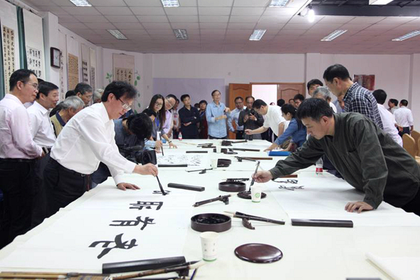 与会领导、嘉宾、首期书法班学员进行现场书法创作。