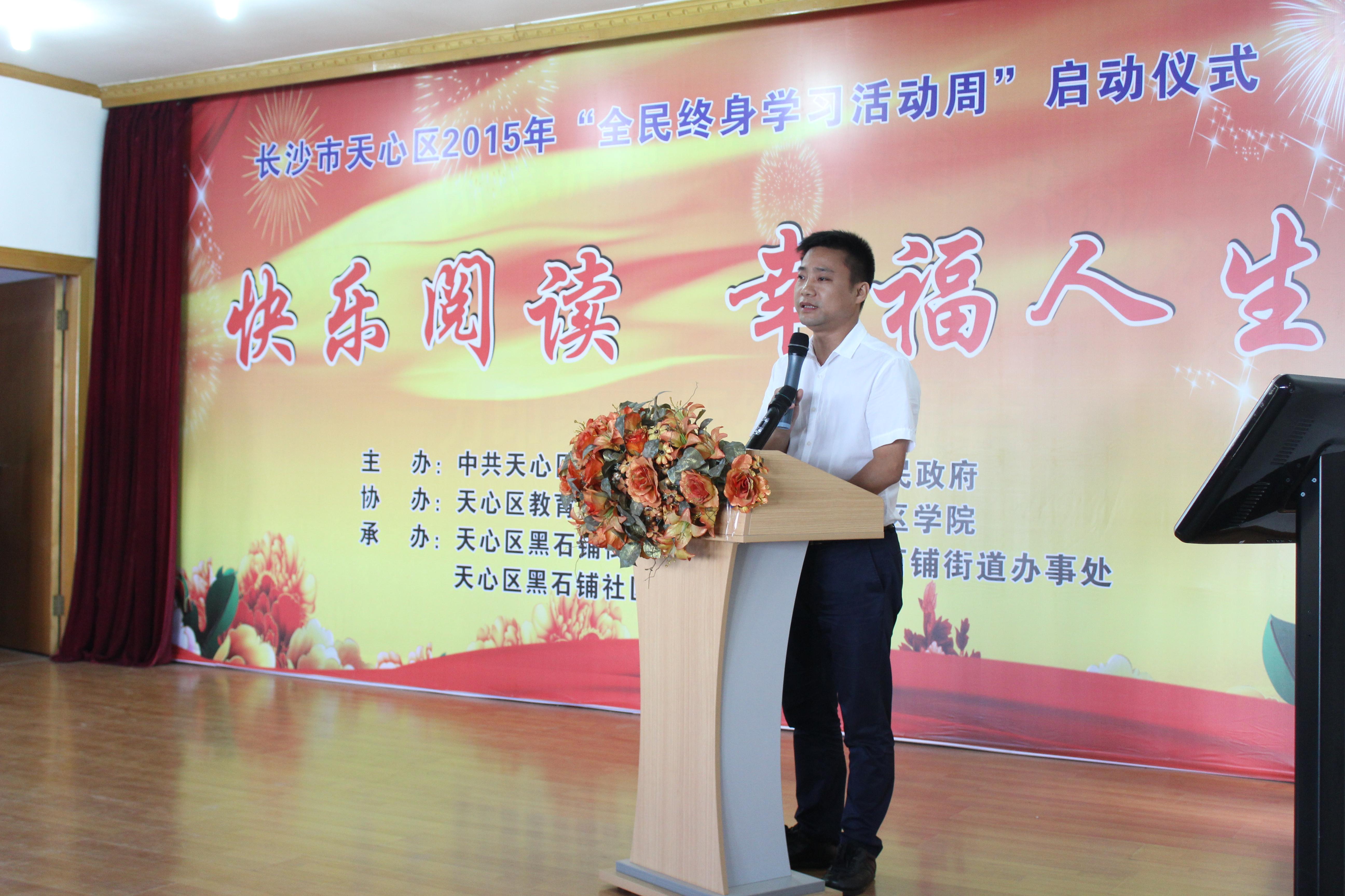 收藏2015年10月23日上午,天心区委、区政府在天心区黑石铺街道一力社区隆重举行2015年“全民终身学习活动周” 启动仪式。会议由黑石铺街道副主任张瑜主持,市广播电视大学校长常立新、天心区区委常委、宣传部部长李曦、天心区政府副调研员沈和成、市教育局高教处处长丁郭以及区教育局党委书记、局长谢巍出席会议。在启动仪式上,谢巍从组织机构、社区教育培训、特色品牌、课程建设、教研成果等方面对天心区社区教育工作进行了全面总结;市教育局高教处处长丁郭发表了热情洋溢的讲话,对天心区社区教育工作取得的成绩表示赞赏,特别是对于天心区今年依托教育系统名师资源成立社区教育课程体系建设专家委员会,实施《百位名师打造百堂优课——社区教育双百工程》项目,并全面推进社区教育特色课程的工作给予了充分肯定,同时希望天心区打造更多的社区教育民生工程,为社区居民提供更多、更优的培训、学习平台;区委常委、宣传部部长李曦在讲话中,从增强终身学习意识、深化终身学习内涵、健全终身学习机制、整合终身学习资源、营造终身学习氛围六个方面对全区社区教育工作提出了更高的要求。最后,随着市广播电视大学校长常立新宣布:“天心区全民终身学习活动周正式启动!”活动现场气氛顿时达到高潮。