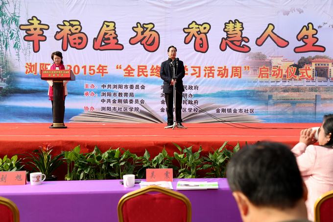 11月26日上午,浏阳市2015年全民终身学习活动周启动仪式在该市金刚镇金市社区何家大屋隆重举行,共300余人参加。开幕式由中共浏阳市委员会、浏阳市人民政府主办,浏阳市教育局、浏阳市文明办、中共金刚镇委员会、金刚镇人民政府承办,浏阳市社区学院、金刚镇社区学校、金市社区协办,由浏阳市人民政府副市长邓雪琴主持。