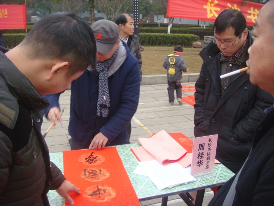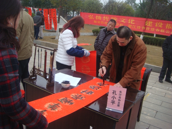 受邀参加此次活动的湖南本地书法艺术家在市书协孔主席的带领下,冒着严寒,一早就来到活动现场,送来祝福,送来吉祥。居民们以火热的心,诚挚地欢迎艺术家们的到来。