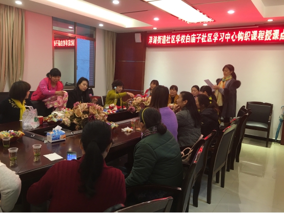 3月8日上午,洋湖街道白庙子社区的活动室内人头攒动、热闹非常,社区30余名中老年妇女在岳麓区社区学院、社区教育志愿者协会特邀授课老师萧萧老师的辅导下免费学习钩织技能。
