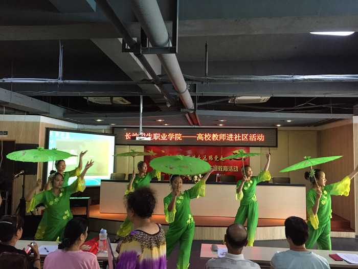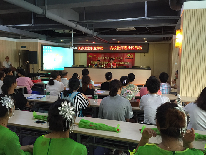 为丰富社区教育内涵,更好地助力社区教育精品社区打造,由我市职业院校社区教育基地——长沙卫生职业学院主办、南城社区承办的“高校教师进社区”活动于6月23日下午2点在南城社区文体活动中心多媒体会议室举行。宣传统战处处长黄勤、继续教育部处长刘念、卫生职院主管院院长彭宏伟、南城社区书记张磊、继续教育部文琛老师、临床医技系专业老师张红艳、社区居民共80余人参加。