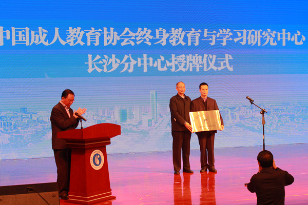 中成协常务副会长谢国东为“中国成人教育协会终身教育与学习研究中心长沙分中心”授牌