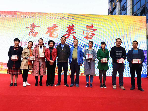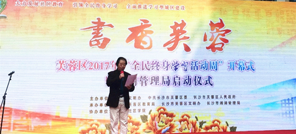 11月3日,长沙市芙蓉区2017年“书香芙蓉--全民终身学习活动周”开幕式在步步高超市广场拉开了序幕。本次活动由长沙市文明办、中共芙蓉区委、区政府主办,区教育局、区文明办、湘湖管理局承办,区社区学院协办。芙蓉区人民政府主任督学、社区学院副院长周率同志主持了启动仪式,湘湖管理局政协联络处主任彭江致欢迎词,长沙市教育局副局长杨庆江,芙蓉区人民政府副区长梁汝岚发表了重要讲话。参加本次活动的还有市社区大学副校长、市广播电视大学党委书记林涛,市文明办综合处处长刘爱梅,区委宣传部副部长、文明办主任易利平,东湖管理局党群副书记、人大工委主任彭鹏,区社区学院副院长、区教科中心主任任质彬等同志。