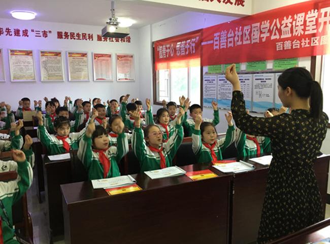 “来,小朋友们跟我做,左手在上右手在下,放至腹部,然后举到眉毛高度,九十度弯腰”。这是百善台社区国学公益课开班第一堂课的拜师礼环节。孩子们一起坐在课室里,学习国学经典。国学老师走进社区,以生动的语言、活波的舞蹈、有趣的故事深入浅出地为大家讲解《论语》等国学经典所蕴含的思想精髓。